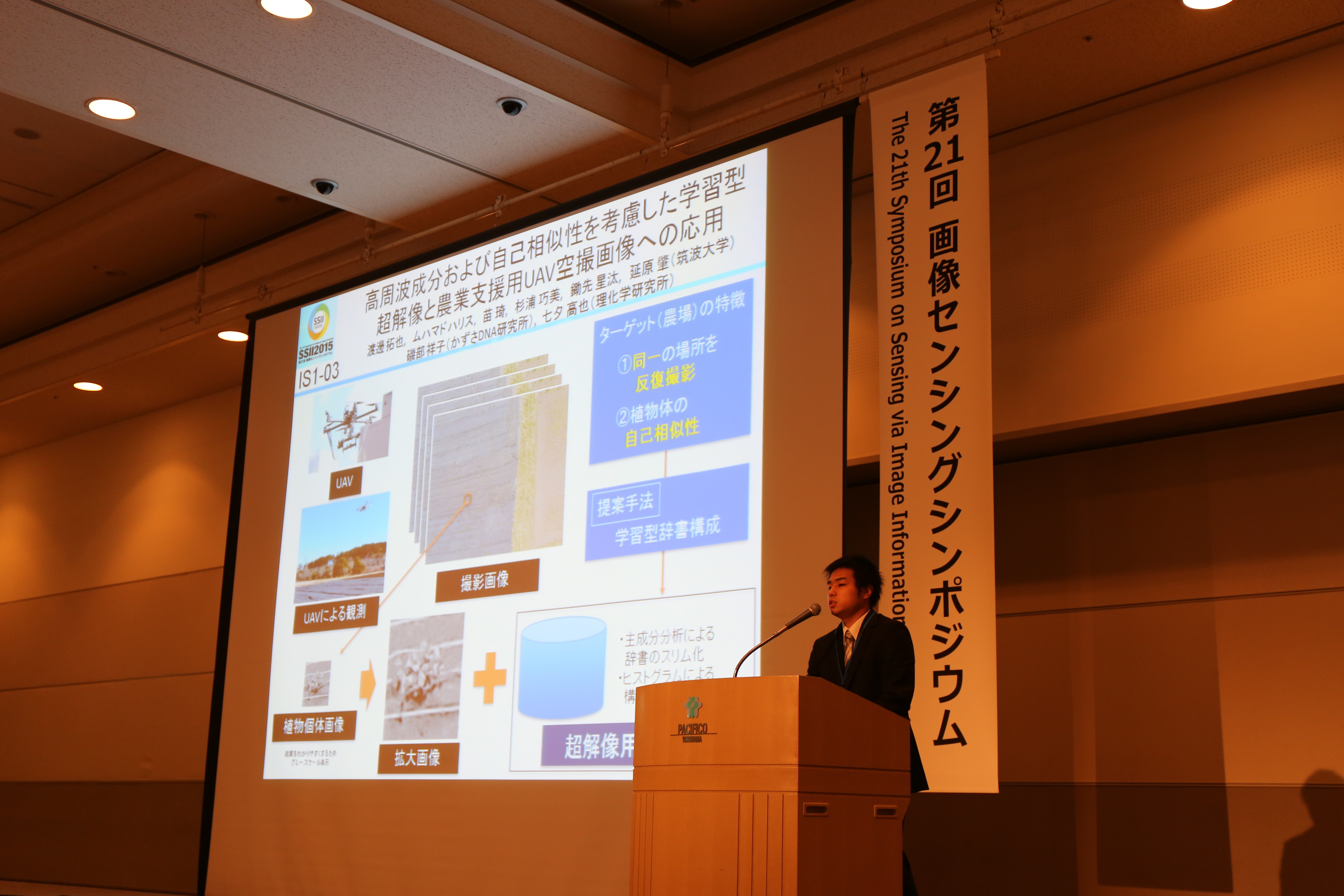 2015年6月11日、第21回画像センシングシンポジウムにおいて、計算知能・マルチメディア研究室の渡邊君と苗君が発表しました。毎年、横浜パシフィコの素晴らしい開催地において行われるシンポジウムですが、ここ数年、ちょっとご無沙汰でした。が、渡邊君と苗君の研究プロジェクトにおいて素晴らしい成果が出ましたので、インタラクティブセッションにおいて報告させてもらいました。