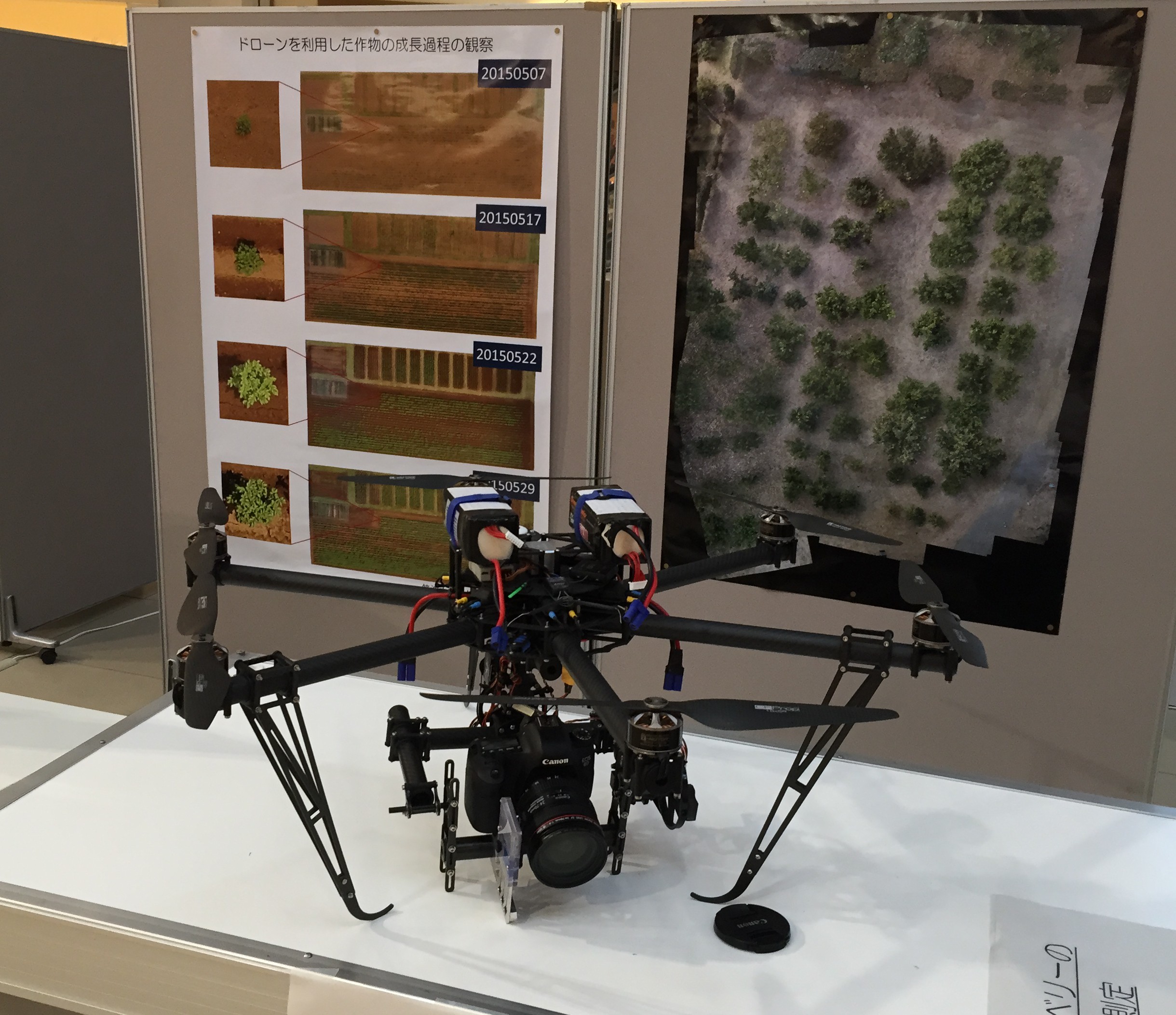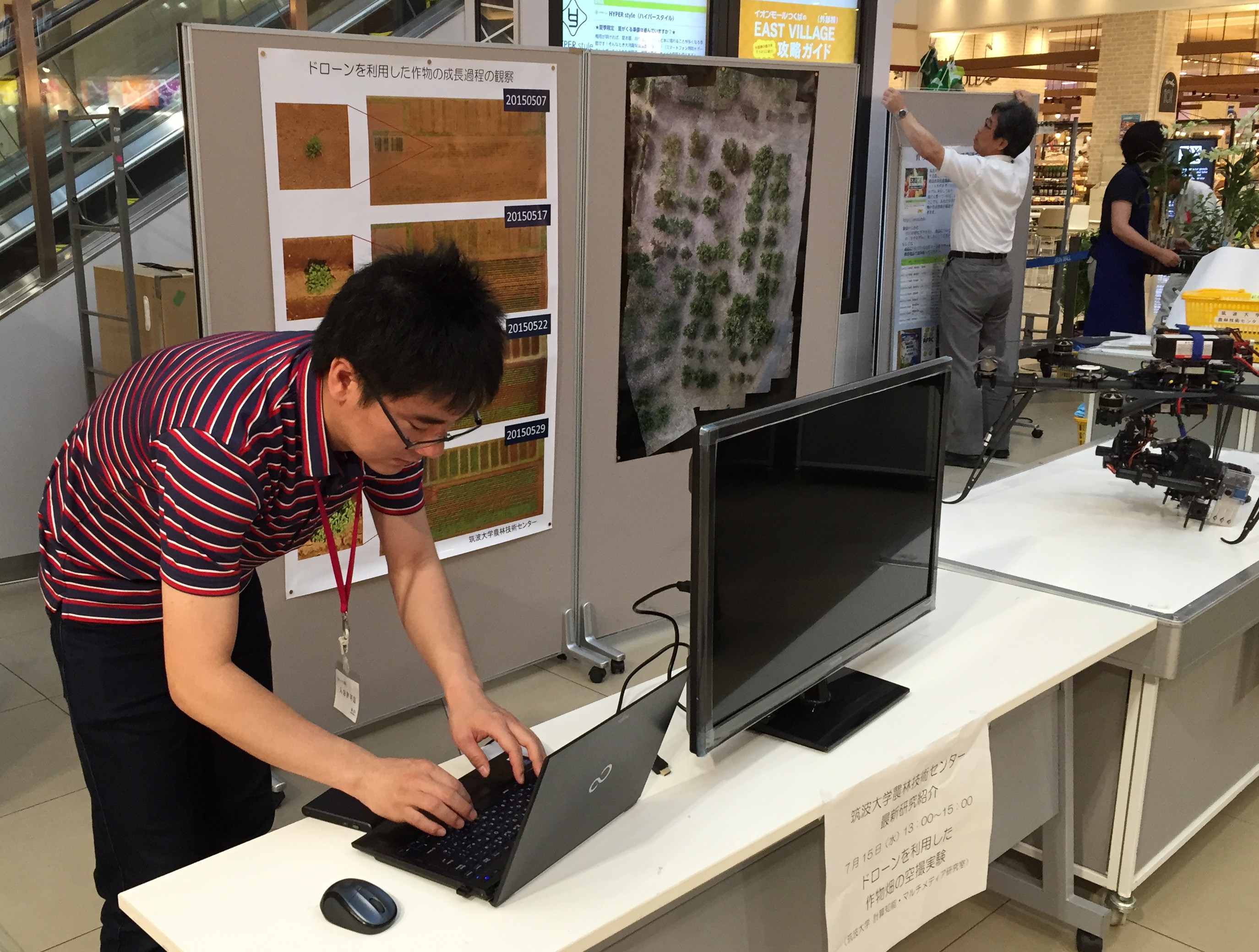 2015年7月15日 筑波大学農林技術センターの農産物直売がイオンモールつくばにおいて実施されることになり、我々、計算知能・マルチメディア研究室も、ドローン実機や空撮実験のポスターの展示をご紹介させていただくことになりました。