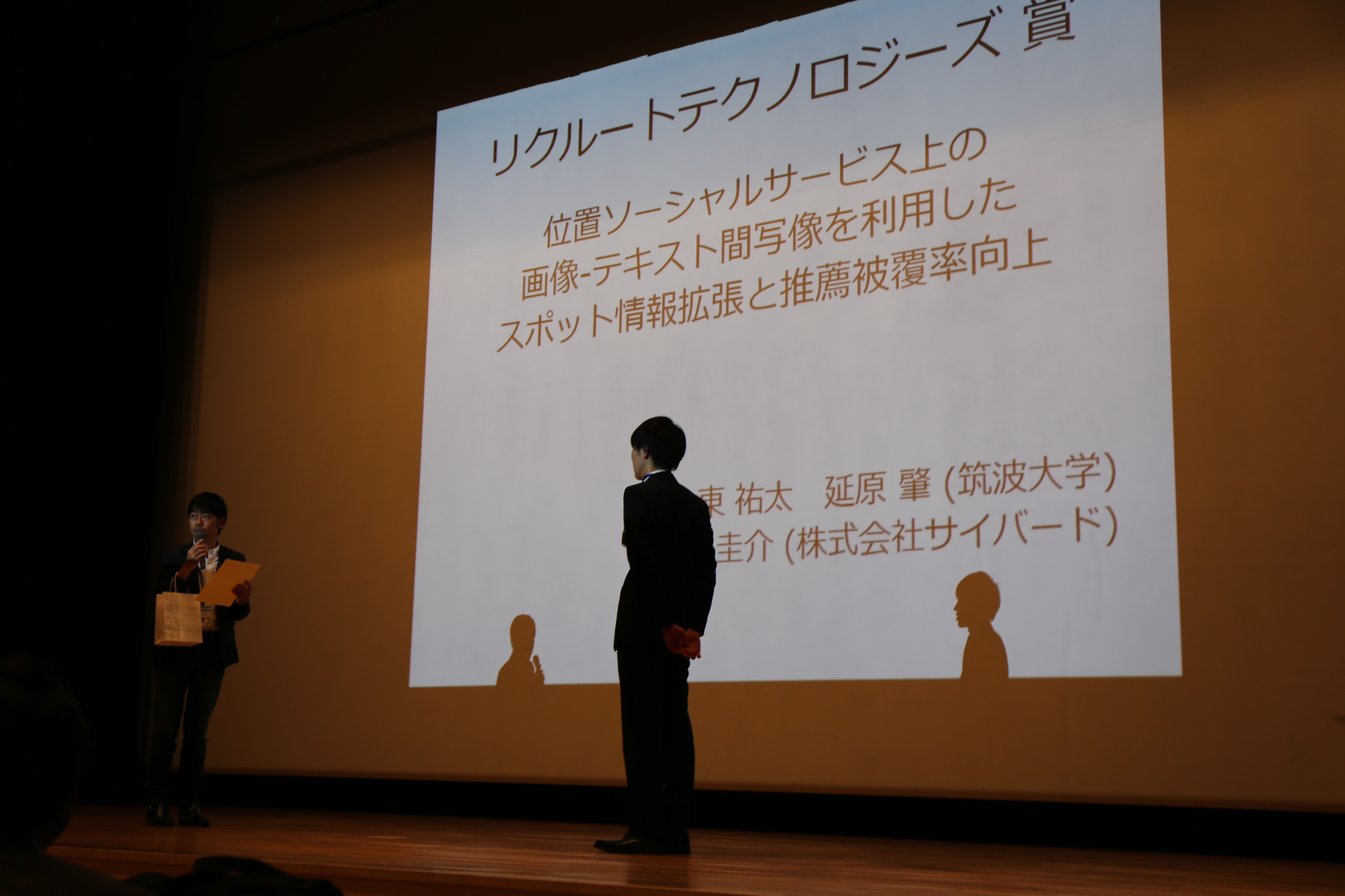 魅力的な論文内容に加え、非常によく練りこまれたプレゼンテーションスライド、そして大東君の語りが評価され、見事、リクルートテクノロジー賞を受賞しました。おめでとうございます!